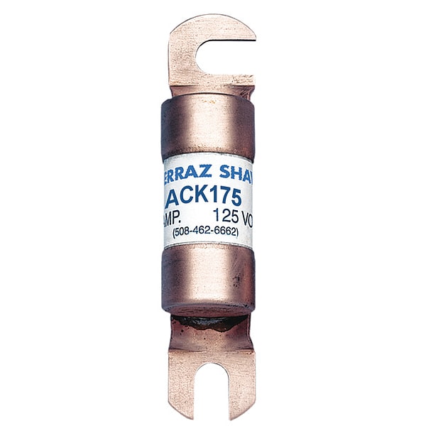 Forklift Limiter Fuse, 175 A, 125 V AC, 125 V DC, ACK Series, Non-Indicating, Time-Delay, Body Style Bolt-On, Non-Rejection, Interrupt Rating 10kA at 125 V DC, 10kA at 125V AC, Fuse Size 4-3/4 in L x 1-1/8 in dia, Length 4 3/4 in, Width Not Applicable, Depth Not Applicable, Diameter 1 1/8 in, Equivalent Brand and Series Littelfuse CCK, Mersen ACK, Equivalent Series ACK, CCK, Body Material Plastic, Dual Element, Standards UL file E60314, UL Recognized Component