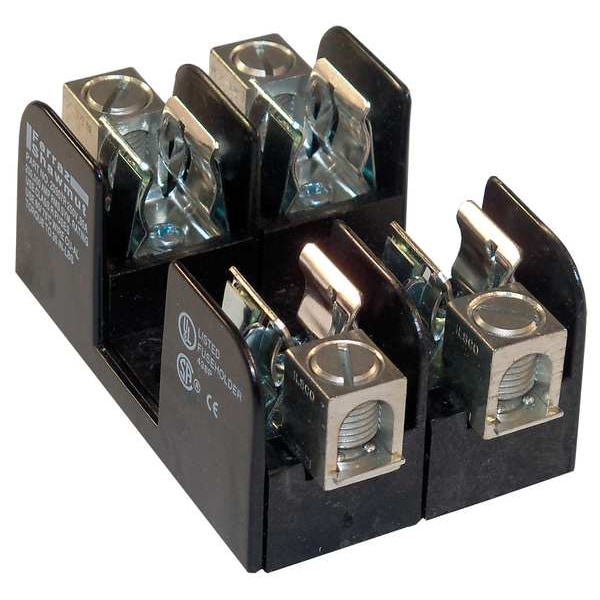 Fuse Block, Fits Fuse Type Class R, Fuse UL Class R, 0 to 30 A, Number of Poles 2, 250V AC/DC, For Fuse Size 2 in L x 9/16 in dia, Compatible Fuse Series A2D-R, A2K-R, FLNR, FRN-R, KLNR, KTN-R, KWN-R, LLNRK, LPN-RK, TR-R, Series 2HKRFB, Non-Indicating, Rejection, Fuse Block Design Open, Wire Range 14 to 2 AWG, Mounting Style Bolt-Down, Body Material Glass Filled Polycarbonate, Connector Type Box Lug, Height 1.38 in, Width 2.03 in, Length 3 in, Spring Reinforced Clip Yes
