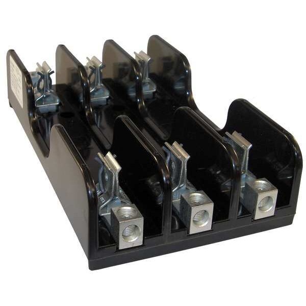 Fuse Block, Fits Fuse Type Class R, Fuse UL Class R, 61 to 100 A, Number of Poles 3, 600V AC/DC, For Fuse Size 7 7/8 in L x 1 5/16 in dia, Compatible Fuse Series A6D-R, A6K-R, FRS-R, KLSR, KTS-R, KWS-R, LLSRK, LPS-RK, TRS-R, Series 6HKRFB, Non-Indicating, Rejection, Fuse Block Design Open, Wire Range 6 to 2/0 AWG, Mounting Style Bolt-Down, Body Material Glass Filled Polycarbonate, Connector Type Box Lug, Height 2.48 in, Width 5.8 in, Length 10.08 in, Spring Reinforced Clip Yes