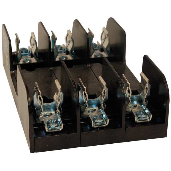 Fuse Block, Fits Fuse Type Class R, Fuse UL Class R, 0 to 30 A, Number of Poles 3, 600V AC/DC, For Fuse Size 5 in L x 13/16 in dia, Compatible Fuse Series A6D-R; A6K-R; FRS-R; KLSR; KTS-R; KWS-R; LLSRK; LPS-RK; TRS-R, Series 6HKRFB, Non-Indicating, Rejection, Fuse Block Design Open, Wire Range 14 to 10 AWG, Mounting Style Bolt-Down, Body Material Glass Filled Polycarbonate, Connector Type Pressure Plate, Height 2.12 in, Width 4.66 in, Length 4 in, Spring Reinforced Clip Yes