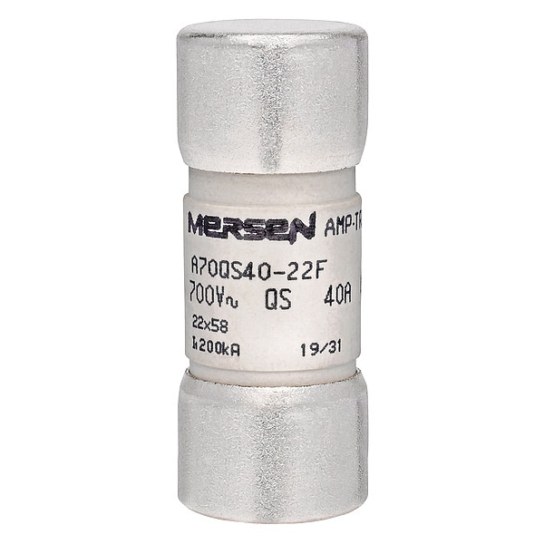 Semiconductor Fuse, 40 A, 690 V AC, 700 V DC, A70QS Series, Non-Indicating, Fast-Acting, Body Style Bolt-On, Non-Rejection, Interrupt Rating 100kA at 700V DC, 200kA at 690V AC, Fuse Size 2-1/4 in L x 55/64 in dia, Length 2 1/4 in, Diameter 7/8 in, Equivalent Brand and Series A70QS, Bussmann FWP, Littelfuse L70QS, Mersen A70P, Equivalent Series A70P, A70QS, FWP, L70QS, Body Material Ceramic, Single Element, Standards UL Recognized Component File E76491, CSA Certified, CSA Certified
