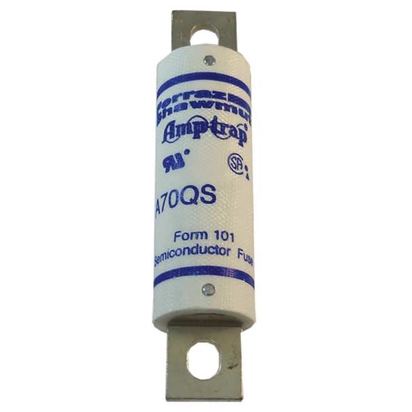 Semiconductor Fuse, 50 A, 700 V AC, 700 V DC, A70QS Series, Non-Indicating, Fast-Acting, Body Style Bolt-On, Non-Rejection, Interrupt Rating 100kA at 700V DC, 200kA at 700V AC, Fuse Size 4-3/8 in L x 1 in dia, Length 4 3/8 in, Diameter 1 in, Equivalent Brand and Series A70QS, Bussmann FWP, Littelfuse L70QS, Mersen A70P, Equivalent Series A70P, A70QS, FWP, L70QS, Body Material Fiberglass, Single Element, Standards CE, UL Recognized, Guide JFHR2, File 60314, CSA Certified LR12636