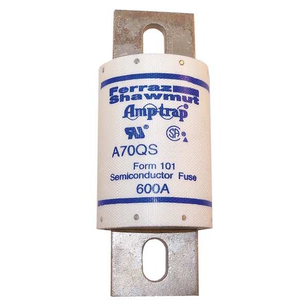 Semiconductor Fuse, 600 A, 700 V AC, 700 V DC, A70QS Series, Non-Indicating, Fast-Acting, Body Style Bolt-On, Non-Rejection, Interrupt Rating 100kA at 700V DC, 200kA at 700V AC, Fuse Size 5-1/16 in L x 2 in dia, Length 5 1/16 in, Diameter 2 in, Equivalent Brand and Series A70QS, Bussmann FWP, Littelfuse L70QS, Mersen A70P, Equivalent Series A70P, A70QS, FWP, L70QS, Body Material Fiberglass, Single Element, Standards CE, UL Recognized, Guide JFHR2, File 60314, CSA Certified LR12636