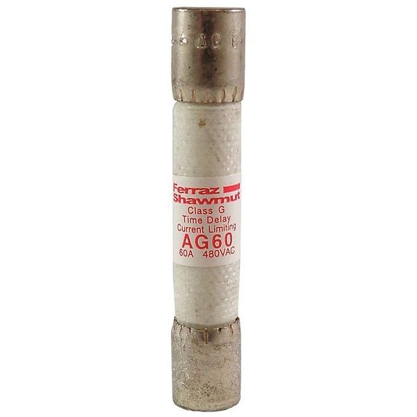 Fuse, 60 A, 480 V AC, Not Applicable, Class G, AG Series, Non-Indicating, Time-Delay, Body Style Cylindrical, Fits Fuse Block Style Rejection, Interrupt Rating 100kA at 480V AC, Fuse Size 2-1/4 in L x 13/32 in dia, Length 2 1/4 in, Diameter 13/32 in, Equivalent Brand and Series Bussmann SC, Littelfuse SLC, Mersen AG, Equivalent Series AG, SC, SLC, Compatible Fuse Block Series Not Applicable, Body Material Fiberglass, Dual Element, Standards CSA Certified to C22.2 No. 248.5, UL Listed 248-5