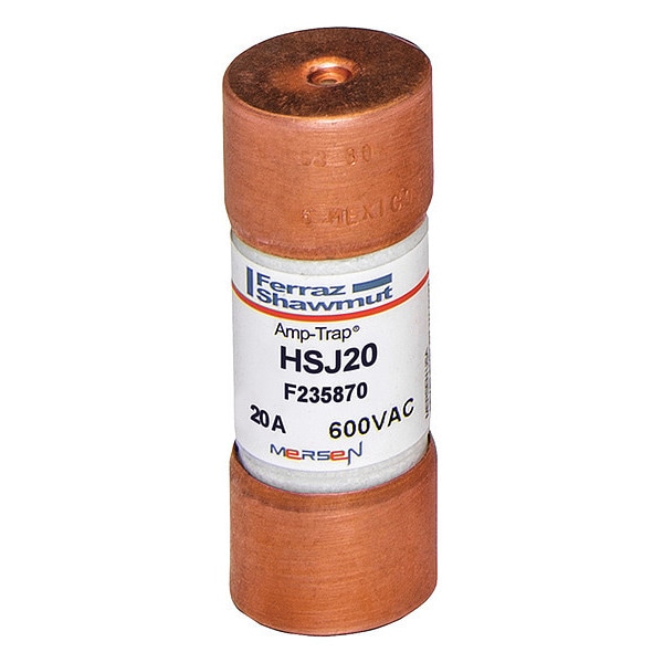 Fuse, 20 A, 600 V AC, 500 V DC, Class J, HSJ Series, Non-Indicating, Very-Fast-Acting, Body Style Cylindrical, Fits Fuse Block Style Rejection, Interrupt Rating 100kA at 500V DC, 200kA at 600V AC, Fuse Size 2-1/4 in L x 13/16 in dia, Length 2 1/4 in, Diameter 13/16 in, Equivalent Brand and Series Bussmann DFJ, Littelfuse LDFJ, Mersen HSJ, Equivalent Series DFJ, HSJ, LDFJ, Compatible Fuse Block Series JFB, SJ, Body Material Glass Fiber-Reinforced Melamine, Single Element