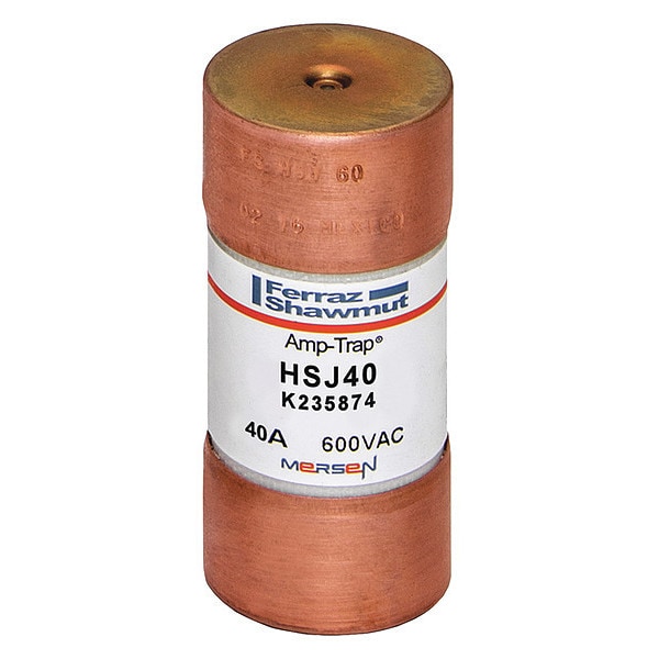 Fuse, 40 A, 600 V AC, 500 V DC, Class J, HSJ Series, Non-Indicating, Very-Fast-Acting, Body Style Cylindrical, Fits Fuse Block Style Rejection, Interrupt Rating 100kA at 500V DC, 200kA at 600V AC, Fuse Size 2-3/8 in L x 1-1/16 in dia, Length 2 3/8 in, Diameter 1 1/16 in, Equivalent Brand and Series Bussmann DFJ, Littelfuse LDFJ, Mersen HSJ, Equivalent Series DFJ, HSJ, LDFJ, Compatible Fuse Block Series JFB, SJ, Body Material Glass Fiber-Reinforced Melamine, Single Element