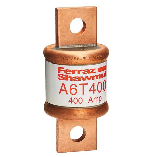 Fuse, 400 A, 600 V AC, 300 V DC, Class T, A6T Series, Non-Indicating, Fast-Acting, Fits Fuse Block Style Non-Rejection, Interrupt Rating 100kA at 300V DC, 200kA at 600V AC, Fuse Size 3-5/8 in L x 1-5/8 in dia, Length 3 5/8 in, Diameter 1 5/8 in, Equivalent Brand and Series Bussmann JJS, Littelfuse JLLS, Mersen A6T, Equivalent Series A6T, JJS, JLLS, Compatible Fuse Block Series 6TFB, GFB, Body Material Glass, Melamine, Single Element, Standards UL/CSA
