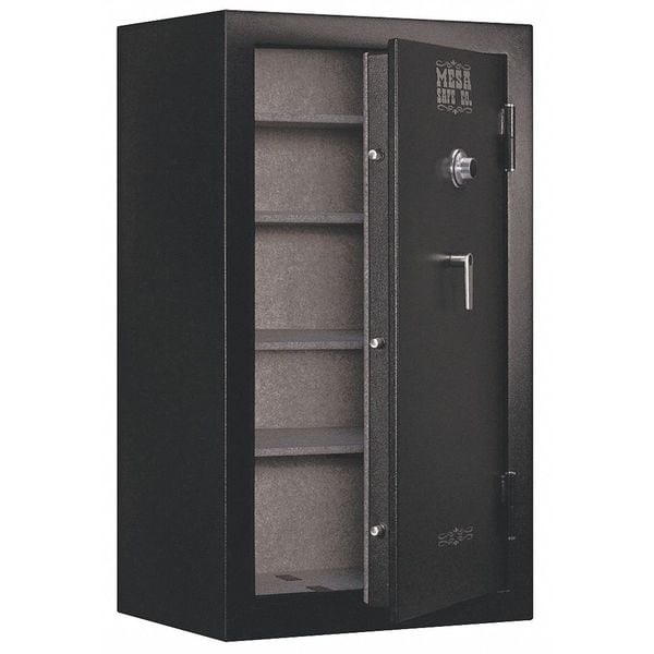 Gun Safe, Color Black, Net Weight 264 lb, Capacity 6.6 cu ft, Fire Rating 30 min, Material Steel, Finish Textured, Finger Print Memory No, Lock Style Combination Dial, 4 Number of Shelves, Number of Bolts 6, Outside Height 55 in, Outside Width 20 in, Outside Depth 20 in, Inside Height 52 in, Inside Width 18 1/4 in, Inside Depth 15 in, Door Opening Height 49 in, Door Opening Width 14 in, Door Plate Thickness 1/8 in, Wall Thickness 1/8 in, Holds (14) Guns