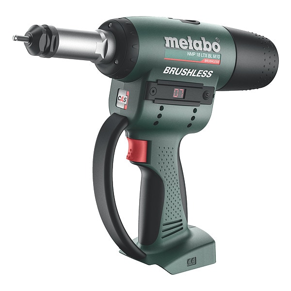 Rivet Tool, Cordless Tool Kit Contents (1) Bare Tool, Cordless, Brushless Motor Yes, Voltage 18 V DC, Pulling Force 3,372 lbf, Stroke Length 3/8 in, Rivet Type Rivet Nut, Blind Rivet Dia. - Aluminum 10 m, Blind Rivet Dia. - Stainless Steel 6 m, Blind Rivet Dia. - Steel 8 m, Number of Batteries Included 0, Battery Capacity Not Applicable, Charger Included No, Case Included Yes, Tool Brand Metabo