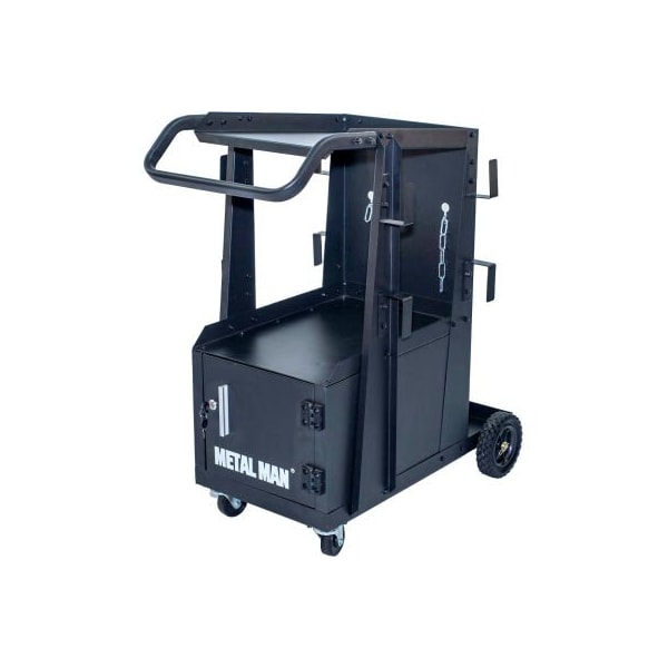 Metal man ttwc3 - three-tier welding cabinet the metal man three-tier welding cabinet is a great way to organize your welding tools. The top shelf has ample space for most brands of welders. The shelf is 34" off the floor putting your welder at a good working height. The slight backwards slope gives the operator easy view of the welder controls. A reversible tow handle allows you to position it best for your welder. The tall second shelf is well positioned for a second welding tool. This cart allows you to store both welders on one cart. The lockable cabinet at the bottom of the cart gives you secure storage for your welding helmet and other welding accessories. specifications: 13-3/4" x 18-3/4" top shelf holds most brands of mig welders, tig welders and plasma cutters 13-3/4" x 19-3/4" shelf with 16-1/2" clearance 13-1/2" x 19-1/2" x 12" lockable storage cabinet holds one 7-1/2" dia. Cylinder 4 sets of cable wraps 100 lb capacity 6" rear wheels 2" front casters