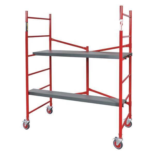 Scaffold, Overall Depth 30 in, Overall Width 72 in, Overall Height 6 ft, Load Capacity 1,000 lb, Material Steel, Max. Work Height 12 ft, Platform Height Adjustable, Platform Depth 8.8 in, Platform Width 58.3 in, Caster Dia. 5 in, Finish Powder Coated, Standards ANSI, CSA, OSHA Compliant, Includes (3) Platforms, (4) Locking Pins, Folding Frame