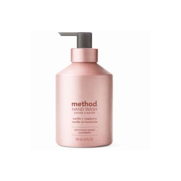 12oz, Premium Gel Hand Wash, Vanilla and Raspberry scent, bottle made from recyclable aluminum Made with naturally derived biodegradable ingredients, for soft, clean hands