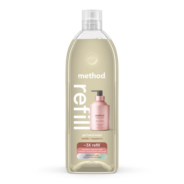 Just another classic fill-good story. in this tale method gel hand wash meets its ultimate sidekick - the 34 oz. vanilla and raspberry refill. with notes of vanilla bean coconut and black raspberry this innovative companion fills your bottle up to 2.8 times. made from 100 percent collected and recycled plastic (minus cap) and with a collection program that gives back to communities you'll get more dope soap without the extra waste-plus a clean conscience. here's to happily ever after hands.