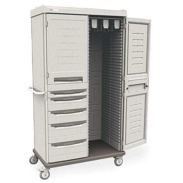 Catheter Storage Cabinet, Mobility Mobile, Number of Shelves 3, Number of Catheter Hooks 15, Number of Catheter Slides 3, Number of Doors 2, Number of Drawers 5, Maximum Number of Catheter Hooks 30, Maximum Number of Catheters 300, Antimicrobial Yes, Door Opening 270 Degrees , Overall Depth 25 in, Overall Height 76 in, Overall Width 43 in, Cabinet Color Taupe, Cabinet Material Polymer, Cabinet Storage Components Catheter Storage, Drawers, Caster Wheel Diameter 5 in