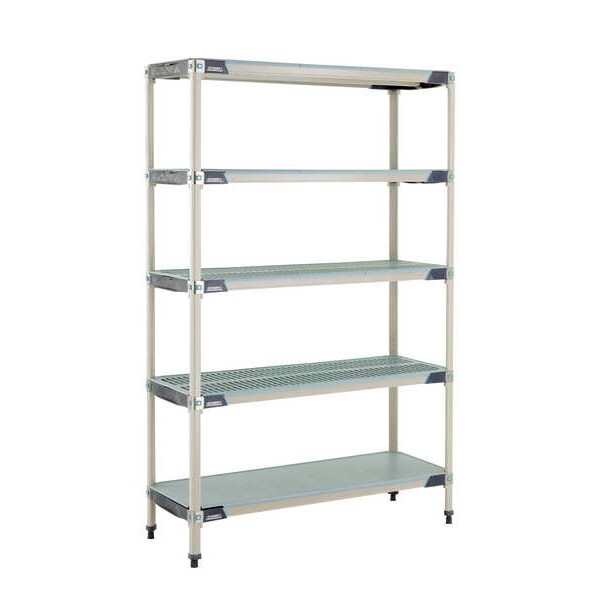 Industrial Shelving Starter, Assembled Unassembled, Adjustability Adjustable, Color Blue/Taupe, Frame Material 304 Stainless Steel, Overall Depth 48 in, Overall Height 74 in, Overall Width 18 in, Shelf Adjustment Increments 1 in, Shelf Style Ventilated; Solid, Shelving Material 304 Stainless Steel, Polymer, Industrial Shelving Strength Rating, Whole Unit Load Capacity 2,000 lb, Number of Shelves 5, Mounting Type Wedge; Post Clamp, Load Capacity per Shelf 400 lb