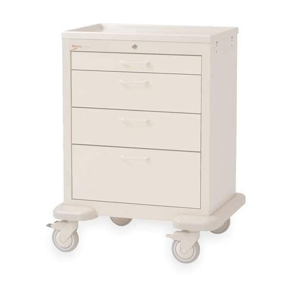 General Medical Supply Cart with Drawers, Assembled/Unassembled Assembled, Material Polymer, Steel, Load Capacity 600 lb, Caster Wheel Dia. 5 in, Caster Wheel/Tread Material Polyurethane, Caster/Wheel Configuration (2) Swivel, (2) Swivel with Brake, Caster Brake Type Face Contact Brake, Cabinet Color Taupe, Drawer Color White, Number of Drawers 4, Number of Shelves 1