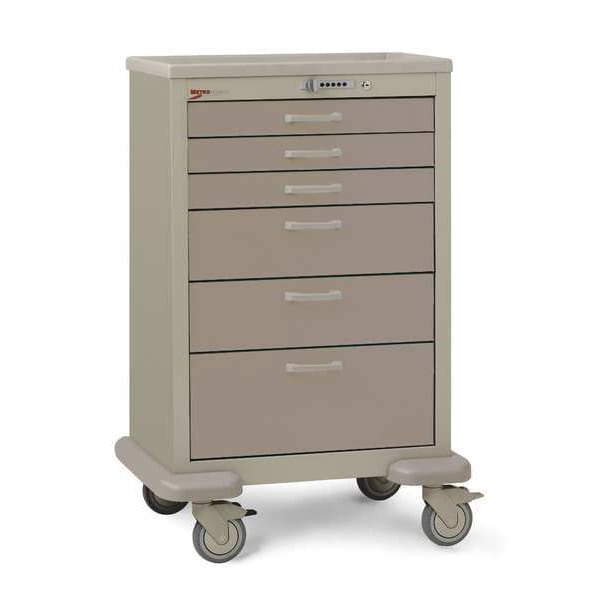 General Medical Supply Cart with Drawers, Assembled/Unassembled Assembled, Material Polymer, Steel, Load Capacity 600 lb, Caster Wheel Dia. 5 in, Caster Wheel/Tread Material Polyurethane, Caster/Wheel Configuration (2) Swivel, (2) Swivel with Brake, Caster Brake Type Face Contact Brake, Cabinet Color Taupe, Drawer Color Dark Tan, Number of Drawers 6, Number of Shelves 1
