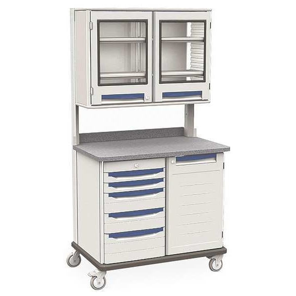 Mobile Medical Equipment Workstations, Assembled/Unassembled Unassembled, Material Polymer, Caster Wheel Dia. 5 in, Caster Wheel/Tread Material Polyurethane, Caster/Wheel Configuration (2) Swivel, (2) Swivel with Brake, Caster Brake Type Total Lock Brake, Cabinet Color Taupe, Drawer Color White, Number of Drawers 5, Number of Shelves 4