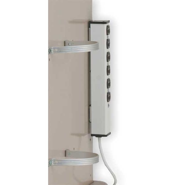 Outlet Strip for Medical Carts, Color White, Cord Length 15 ft, Finish Powder Coated, Includes 15 ft Cord, Medical Grade Yes, Number of Outlets 6, Overall Depth 8 in, Overall Height 4 1/2 in, Overall Width 5 1/2 in, Plug Type Three Prong, Voltage 120 V AC