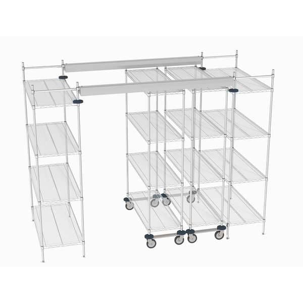 Color Silver, Material Steel, Overall Height 86 3/4 in, Overall Length 115 in, 48 in Overall Width, Track Height 74 in, Track Length 72 in, Track Width 48 in, Mounting Location Middle, Number of Pieces 36, Number of Tracks 2, Finish Chrome, Includes 18 in Tie Bar End Kit, (16) Shelves, (2) 18 in Mobile Kits, (8) 74 in Top Trk Mobile Posts, (8) 86 in Posts, Metro Super Erecta Compatible Brand and Series, NSF