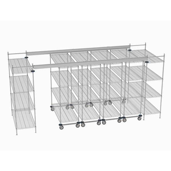 Color Silver, Material Steel, Overall Height 86 3/4 in, Overall Length 187 in, 60 in Overall Width, Track Height 74 in, Track Length 138 in, Track Width 60 in, Mounting Location Middle, Number of Pieces 54, Number of Tracks 2, Finish Chrome, Metro Super Erecta Compatible Brand and Series, NSF