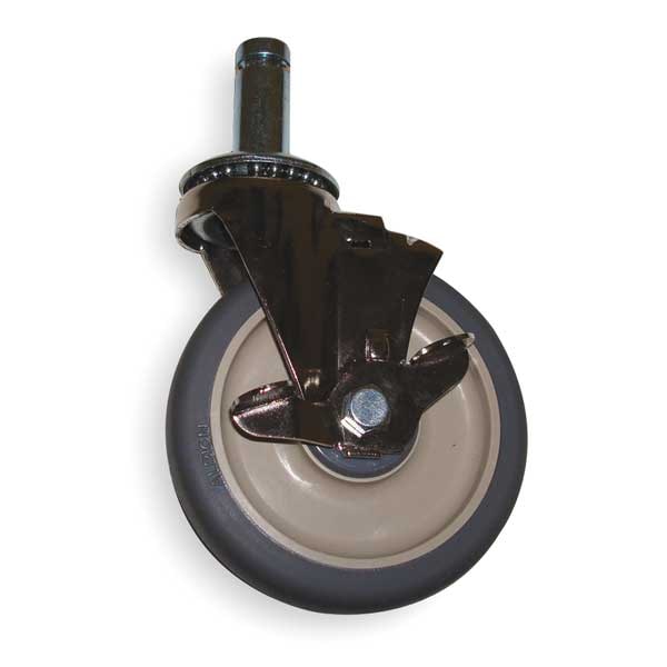 Stem Caster, Swivel Caster with Brake, 300 lb Load Rating, 300 to 999 lb, 5 in Wheel Dia., 1 1/4 in Wheel Width, Polyurethane Wheel/Tread Material, 6 1/16 in Mounting Height, Ball, 27/32 in x 2-3/16 in Caster Stem Size, Friction Ring, Steel Caster Frame Material, Nickel Plated Frame Finish, Yes Non-Marking, 1 Number of Wheels