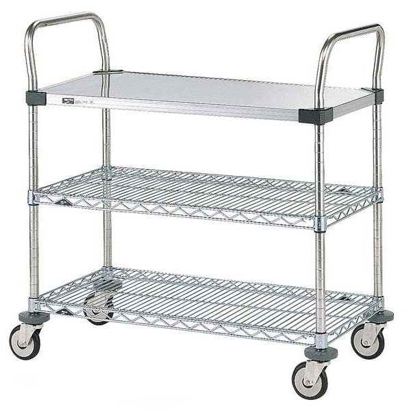 Corrosion-Resistant Utility Cart with Shallow Lipped Wire Shelves, Load Capacity 375 lb, Number of Shelves 3, Shelf Width 21 in, Shelf Length 36 in, Material Stainless Steel, Finish Chrome, Caster Wheel Dia. 5 in, Color Silver, Caster Brake Type No Brake Included, Caster Wheel/Tread Material Rubber, Caster/Wheel Configuration (4) Swivel, Distance Between Shelves 10 in, Handle Type (2) Raised, Lip Style 4-Sided Lipped, Shelf Orientation Flat, Collapsible No, Overall Height 39 in