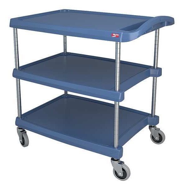 Utility Cart, Number of Shelves 3, Lip Style 4-Sided Lipped, Load Capacity 400 lb, Shelf Length 31 in, Shelf Width 23 in, Top Shelf Height 36 in, Distance Between Shelves 11 in, Distance Between Top and Middle Shelf 11 in, Distance Between Middle and Bottom Shelf 11 in, Handle Type Flat, Handle Height 35 1/2 in, Caster Brake Type No Brake Included, Caster Wheel/Tread Material Thermoplastic Rubber, Caster Wheel Dia. 4 in, Caster/Wheel Configuration (4) Swivel, Lip Height 3/8 in