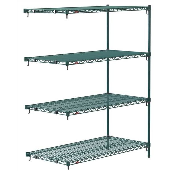 Wire Shelving, Shelf, Metal, Adjustable Shelving, Adjustability Adjustable, Green Color, Epoxy Coated, Includes (2) Posts, (2) S Hooks Per Shelf, Load Capacity per Shelf 500 lb, Material Stainless Steel, Overall Depth 24 in, Overall Height 63 in, Overall Width 42 in, Wet Recommended Environments, Standards HACCP, NSF, 2,000 lb, Shelf Configuration Add-On, Number of Shelves 4