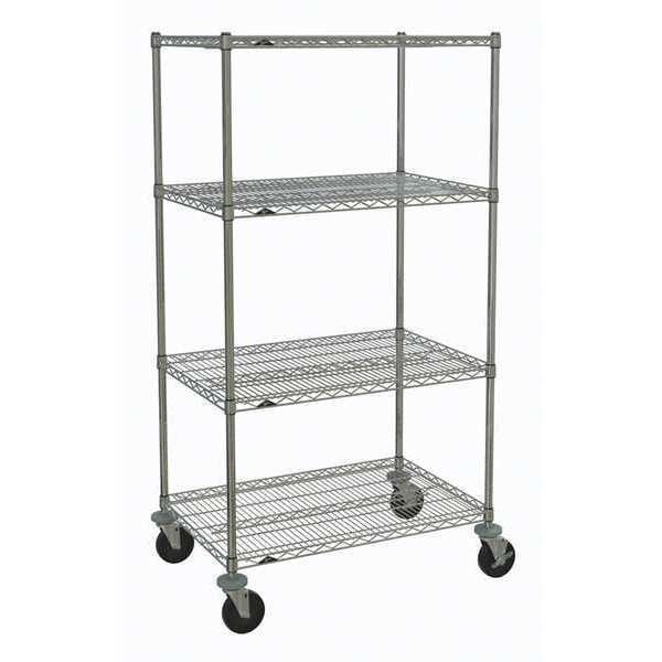 Wire Shelving Unit, Steel, Chrome, Silver, Overall Depth 24 in, Overall Height 67 7/8 in, Overall Width 36 in, Caster Wheel/Configuration (2) Swivel, (2) Swivel with Brakes, Caster Wheel/Tread Material Rubber, Caster Wheel Diameter 5 in, Load Capacity per Shelf 150 lb, Whole Unit Load Capacity 600 lb, Number of Shelves 4, Shelf Adjustment Type Split Sleeve, Shelf Adjustment Increments 1 in, Shelving Configuration Standalone, Adjustability Adjustable, Includes (4) Posts, Post Shape Round