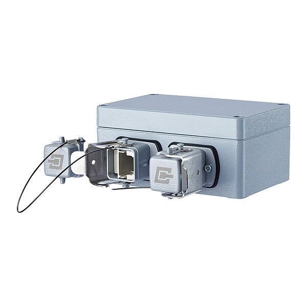 Data Connector Outlet, Product Type Wall Outlet, Body Material Aluminum, Overall Height 2.244 in, Overall Width 5.655 in, Overall Depth 4.921 in, Number of Ports 2, Connection Type E-DAT Industry RJ45 Coupler Insert, E-DAT Industry RJ45 Field Jack Insert (T568A, T568B or Profinet), E-DAT Industry USB Coupler Insert, Includes Connector Unequipped, Color Gray, Mounting Angle 180 Degrees , Mounting Type Surface