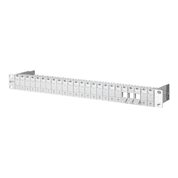 Patch Panel, Product Type Module Frame, Body Material ABS, Overall Height 1.75 in, Overall Width 19 in, Overall Depth 3.74 in, Number of Ports 24, Connection Type Coax Module F, Coax Module IEC, OpDAT Module LC-Duplex APC OS2, OpDAT Module LC-Duplex OM2, OpDAT Module LC-Duplex OM3, OpDAT Module LC-Duplex OM4, OpDAT Module LC-Duplex OS2, UTP Module 8(8) Cat6, UTP Module 8(8) Cat6A, UTP Module Cat6A, Shielded No, Includes Connector Unequipped, Color Light Gray, Mounting Type Rack