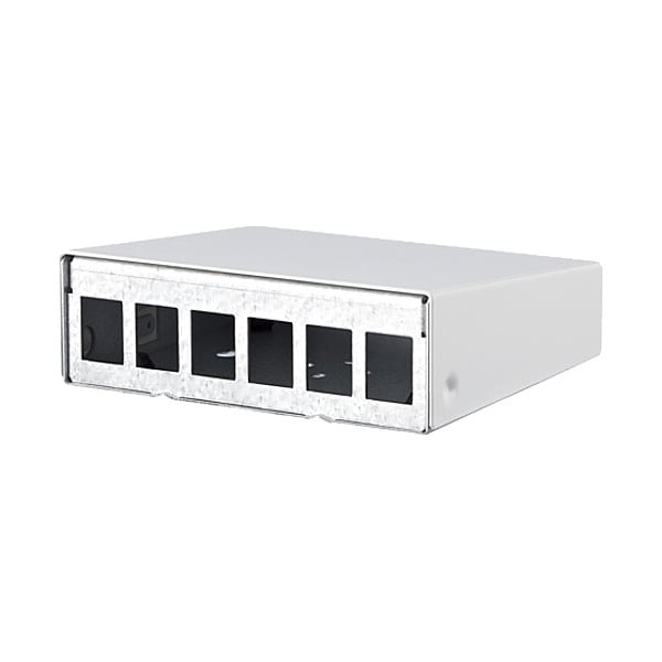 RJ45 Housing, Product Type Module Housing, Body Material Steel, Overall Height 1.718 in, Overall Width 4.921 in, Overall Depth 4.329 in, Number of Ports 6, Connection Type RJ45, Includes Connector Unequipped, Color White, Mounting Type Surface
