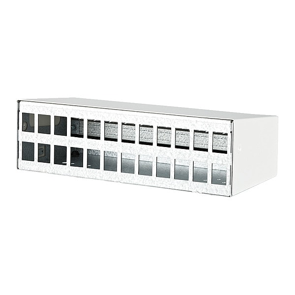 RJ45 Housing, Product Type Module Housing, Body Material Steel, Overall Height 2.978 in, Overall Width 9.468 in, Overall Depth 4.329 in, Number of Ports 24, Connection Type RJ45, Includes Connector Unequipped, Color White, Mounting Type Surface