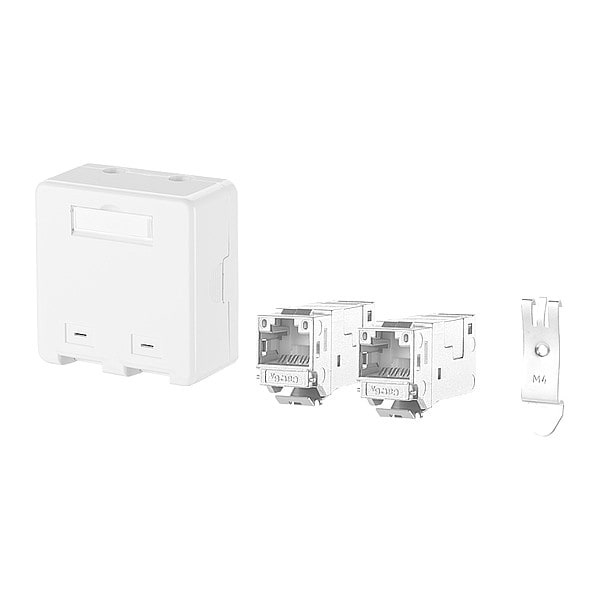 RJ45 Keystone, Product Type Extension Box, Body Material GD-Zn (Zinc Die-Cast), Overall Height 1.181 in, Overall Width 2.489 in, Overall Depth 2.559 in, Number of Ports 2, Connection Type IDC Connection x RJ45, Shielded Yes, Includes Connector Equipped, Color White, Mounting Angle 180 Degrees , Mounting Type Rail