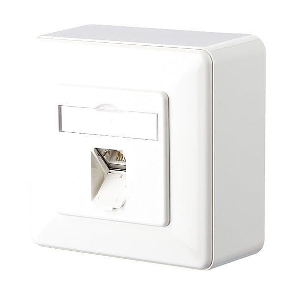 Wall Outlet, Product Type Wall Outlet, Body Material GD-Zn (Zinc Die-Cast), Overall Height 3.346 in, Overall Width 3.346 in, Overall Depth 1.693 in, Number of Ports 1, Connection Type LSA Terminal Block x RJ45, Shielded Yes, Includes Connector Equipped, Color White, Mounting Angle 45 Degrees , Mounting Type AP