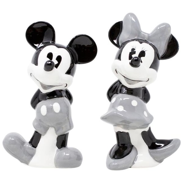 Officially licensed Disney Mickey and Minnie Grey Salt and Pepper Shakers. Features classic "Mickey and Minnie Mouse" designs on grey ceramic salt and pepper shakers. Comes in a set of two.