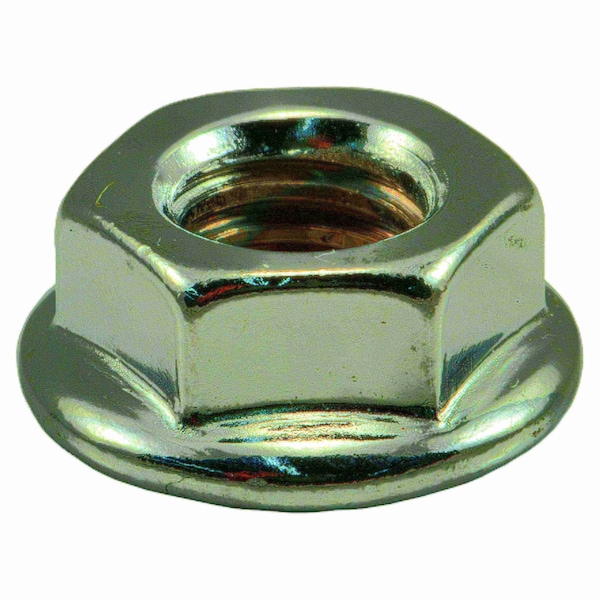 A flange nut has a wide flange at one end that acts as an integrated, non-spinning washer. This serves to distribute the pressure of the nut over the part being secured, reducing the chance of damage to the part and making it less likely to loosen as a result of an uneven fastening surface.