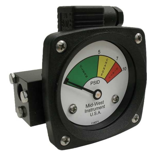 3-Color Differential Pressure Indicator, Accuracy +/-5 Percent of Full Scale, Gauge Case Material Glass Reinforced Thermoplastic, Lens Material Acrylic, IP/NEMA Rating IP65, NEMA 4X, Nominal Dial Size 2 1/2 in, Panel-Mountable Yes, Pressure Gauge Type Differential Filter Indicator, Process Connection Size 1/4 in, Process Connection Type NPT, Process Connection Gender Female, Process Connection Location End, Sensor Material Buna-N, Pressure Range 0 to 10 psid