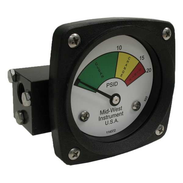 3-Color Differential Pressure Indicator, Accuracy +/-5 Percent of Full Scale, Gauge Case Material Glass Reinforced Thermoplastic, Lens Material Acrylic, IP/NEMA Rating NEMA 4X, Nominal Dial Size 2 1/2 in, Panel-Mountable Yes, Pressure Gauge Type Differential Filter Indicator, Process Connection Size 1/4 in, Process Connection Type NPT, Process Connection Gender Female, Process Connection Location End, Sensor Material Buna-N, Pressure Range 0 to 25 psid, Maximum Working Static Pressure 1,000 psig