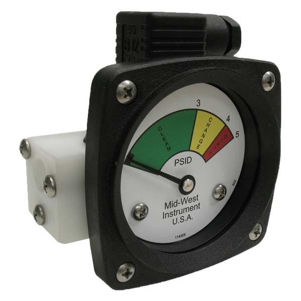 3-Color Differential Pressure Indicator, Accuracy +/-5 Percent of Full Scale, Gauge Case Material Glass Reinforced Thermoplastic, Lens Material Acrylic, IP/NEMA Rating IP65, NEMA 4X, Nominal Dial Size 2 1/2 in, Panel-Mountable Yes, Pressure Gauge Type Differential Filter Indicator, Process Connection Size 1/4 in, Process Connection Type NPT, Process Connection Gender Female, Process Connection Location End, Sensor Material Viton, Pressure Range 0 to 5 psid