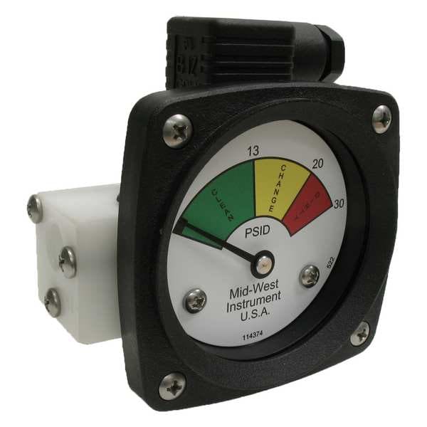 3-Color Differential Pressure Indicator, Accuracy +/-5 Percent of Full Scale, Gauge Case Material Glass Reinforced Thermoplastic, Lens Material Acrylic, IP/NEMA Rating IP65, NEMA 4X, Nominal Dial Size 2 1/2 in, Panel-Mountable Yes, Pressure Gauge Type Differential Filter Indicator, Process Connection Size 1/4 in, Process Connection Type NPT, Process Connection Gender Female, Process Connection Location End, Sensor Material Viton, Pressure Range 0 to 30 psid