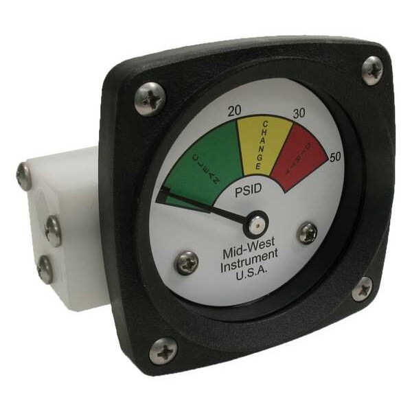 3-Color Differential Pressure Indicator, Accuracy +/-5 Percent of Full Scale, Gauge Case Material Glass Reinforced Thermoplastic, Lens Material Acrylic, IP/NEMA Rating NEMA 4X, Nominal Dial Size 2 1/2 in, Panel-Mountable Yes, Pressure Gauge Type Differential Filter Indicator, Process Connection Size 1/4 in, Process Connection Type NPT, Process Connection Gender Female, Process Connection Location End, Sensor Material Viton, Pressure Range 0 to 50 psid, Maximum Working Static Pressure 1,000 psig