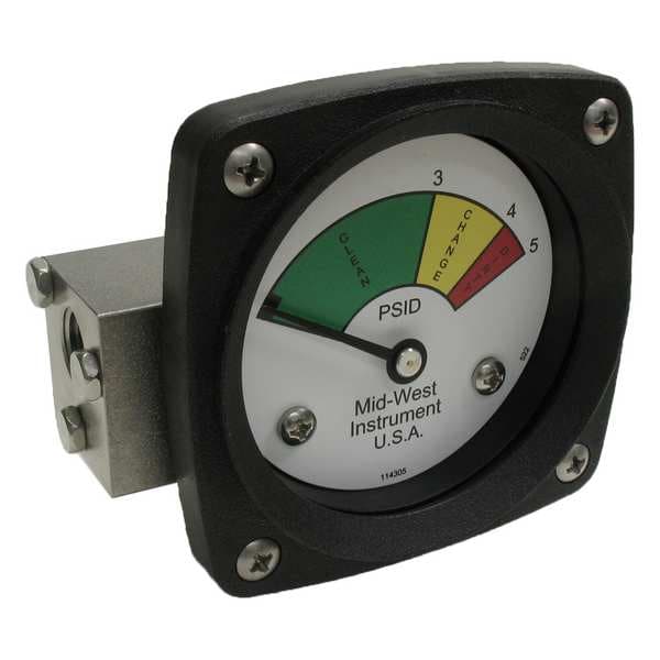3-Color Differential Pressure Indicator, Accuracy +/-5 Percent of Full Scale, Gauge Case Material Glass Reinforced Thermoplastic, Lens Material Acrylic, IP/NEMA Rating NEMA 4X, Nominal Dial Size 2 1/2 in, Panel-Mountable Yes, Pressure Gauge Type Differential Filter Indicator, Process Connection Size 1/4 in, Process Connection Type NPT, Process Connection Gender Female, Process Connection Location End, Sensor Material Viton, Pressure Range 0 to 5 psid, Maximum Working Static Pressure 1,000 psig
