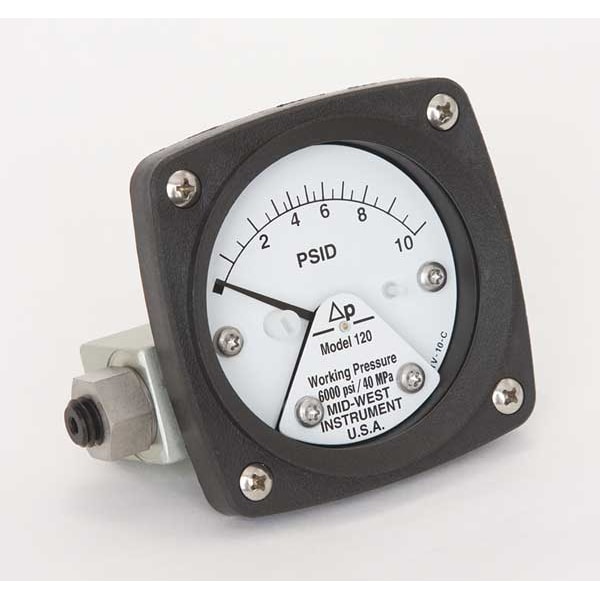 Differential Pressure Gauge, Differential Pressure Range 0 to 10 psi, Rated Total Pressure 3000 psi, Connection Size 1/4 In. FNPT, Dial Size 2-1/2 In., Body Material Aluminum, Scale Type Pressure, Pressure Range Minor Div. 0.50 psi, Accuracy +/-3/2/3 Percent, Dial Material Engineered Plastic, Piston Material Stainless Steel, Seal Material Buna-N, Ambient Operating Range -40 Degrees to 200 Degrees F..