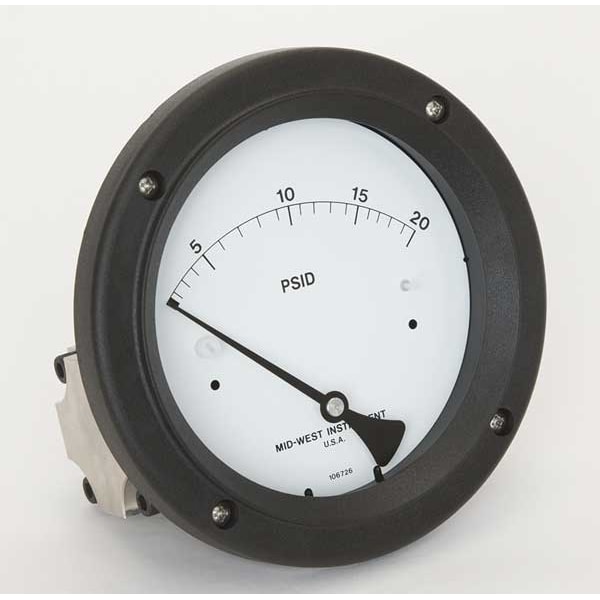 Differential Pressure Gauge, Pressure Scale Type, Pressure Range 0 to 20 PSID, Pressure Range Minor Div 1.0 PSID, Rated Total Pressure 3000 PSIG, Full Scale Accuracy +/-3-2-3 %, Connection Size NPT 1/4 In FNPT In, Dial Size 4-1/2 In In, Aluminum Body Material, Plastic Dial Material, Buna N Diaphragm Material, Buna N Seal Material, Includes Instructions, Warranty Length 5 Year, Ambient Operating Range -40 to 200 F