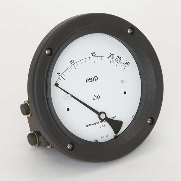 Differential Pressure Gauge, Pressure Scale Type, Pressure Range 0 to 30 PSID, Pressure Range Minor Div 1.0 PSID, Rated Total Pressure 3000 PSIG, Full Scale Accuracy +/-3-2-3 %, Connection Size NPT 1/4 In FNPT In, Dial Size 4-1/2 In In, Aluminum Body Material, Plastic Dial Material, Buna N Diaphragm Material, Buna N Seal Material, Includes Instructions, Warranty Length 5 Year, Ambient Operating Range -40 to 200 F