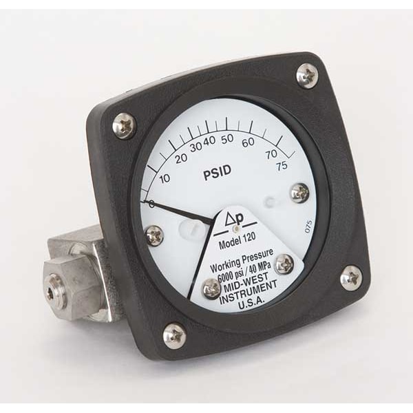 Differential Pressure Gauge, Pressure Scale Type, Pressure Range 0 to 75 PSID, Pressure Range Minor Div 5.0 PSID, Rated Total Pressure 6000 PSIG, Full Scale Accuracy +/-3-2-3 %, Connection Size NPT 1/4 In FNPT In, Dial Size 2-1/2 In In, Aluminum Body Material, Plastic Dial Material, Stainless Steel Piston Material, Includes Instructions, Warranty Length 5 Year, Ambient Operating Range -40 to 200 F