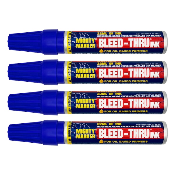 The IM-14, Mighty Marker, Jumbo Bleed-Thru marker is engineered for marks to Bleed-Thru oil-based primers and topcoats on unpainted surfaces. This industrial marker is valve action activated to keep it from drying out and comes with extra replaceable nibs, so you can use all the ink within. Equipped with a broad chisel nib for larger markings and containing 22ml of ink, the marker lasts and handles big marking jobs easily. To cover the marks, seal the surface with a water or alcohol-based sealant.