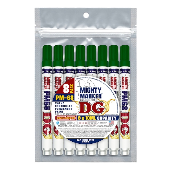 The PM-68 Mighty Marker DG is a heavy-duty, xylene-free paint marker built for permanent marking in industrial environments. Equipped with valve-action technology, it prevents drying out and ensures full use of the marker's contents. It dries in 25 seconds and is resistant to degreasing solvents, coolants, cutting fluids, alcohol, and extreme conditions. Ideal for smooth, non-porous surfaces like metal, aluminum, steel, and plastics, it provides durable marks that withstand oil, grease, dirt, weather, and industrial solvents.